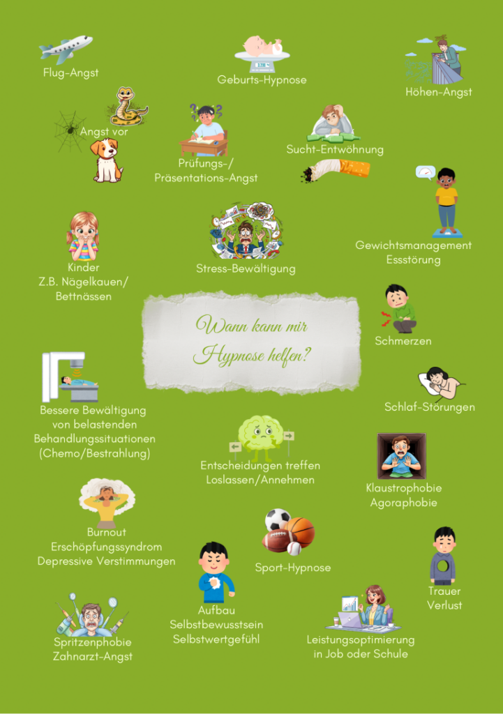 Ein großes Thema sind irrationale Ängste, wie die Angst vor irgendwelchen Tieren (Spinnen, Schlangen, Mäuse, Hunde etc.), aber auch Flugangst, Höhenangst, Platzangst (Klaustrophobie/Agoraphobie), Präsentations- und Prüfungsangst, ja auch Zahnarztangst (mit der ich als Zahnärztin viel beschäftigt war) bis hin zu Zwangsstörungen und Panikattacken.